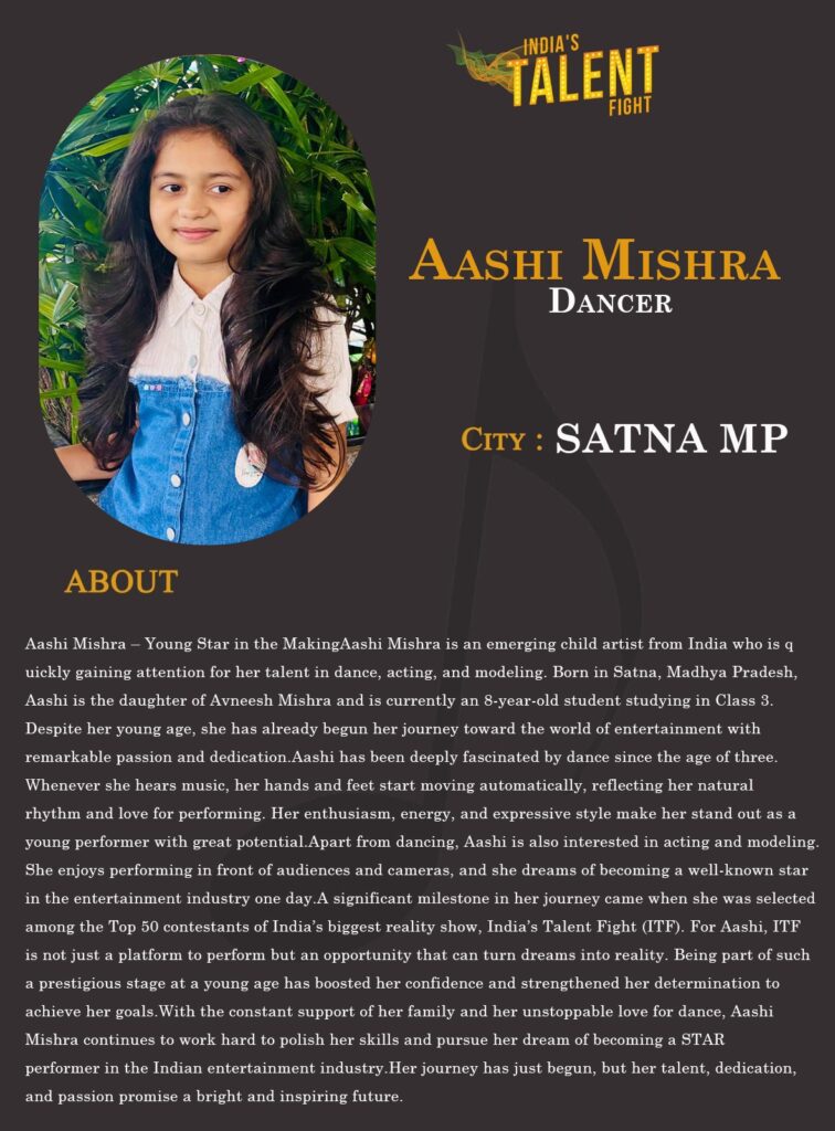 A significant milestone in her journey came when she was selected among the Top 50 contestants of India’s biggest reality show, India’s Talent Fight (ITF). For Aashi, ITF is not just a platform to perform but an opportunity that can turn dreams into reality. Being part of such a prestigious stage at a young age has boosted her confidence and strengthened her determination to achieve her goals.