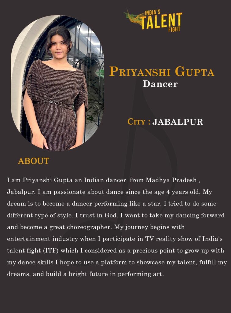 I am Priyanshi Gupta an Indian dancer from Madhya Pradesh ,Jabalpur. I am passionate about dance since the age 4 years old. My dream is to become a dancer performing like a star. I tried to do some different type of style. I trust in God. I want to take my dancing forward and become a great choreographer. My journey begins with entertainment industry when I participate in TV reality show of India’s talent fight (ITF) which I considered as a precious point to grow up with my dance skills I hope to use a platform to showcase my talent, fulfill my dreams, and build a bright future in performing art.