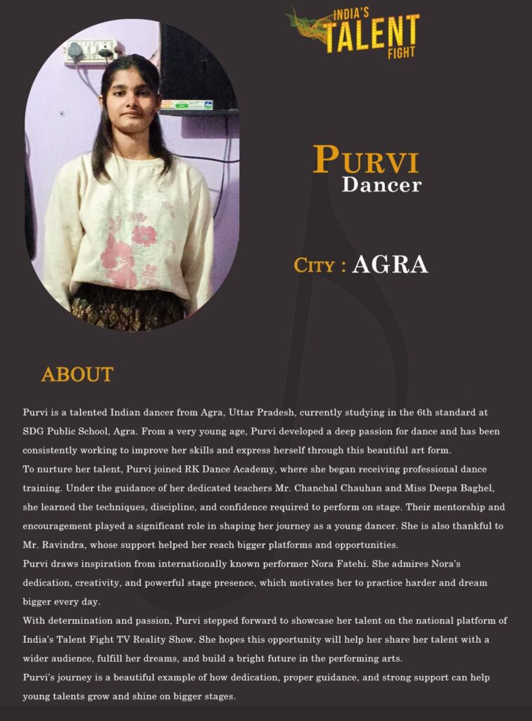 With determination and passion, Purvi stepped forward to showcase her talent on the national platform of India’s Talent Fight TV Reality Show. She hopes this opportunity will help her share her talent with a wider audience, fulfill her dreams, and build a bright future in the performing arts.