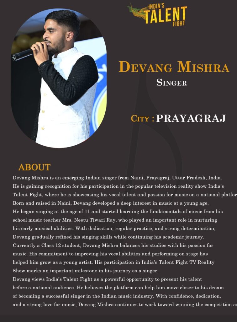 Currently a Class 12 student, Devang Mishra balances his studies with his passion for music. His commitment to improving his vocal abilities and performing on stage has helped him grow as a young artist. His participation in India’s Talent Fight TV Reality Show marks an important milestone in his journey as a singer.