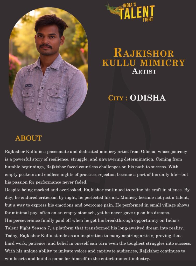 His perseverance finally paid off when he got his breakthrough opportunity on India’s Talent Fight Season 7, a platform that transformed his long-awaited dream into reality. Today, Rajkishor Kullu stands as an inspiration to many aspiring artists, proving that hard work, patience, and belief in oneself can turn even the toughest struggles into success.