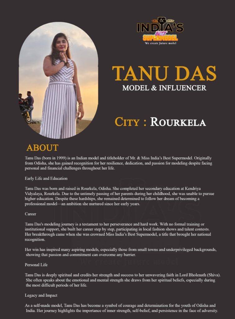Tanu Das (born in 1999) is an Indian model and titleholder of Mr. & Miss India’s Best Supermodel. Originally from Odisha, she has gained recognition for her resilience, dedication, and passion for modeling despite facing personal and financial challenges throughout her life.