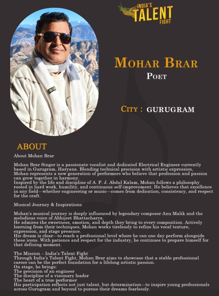 Through India’s Talent Fight, Mohan Brar aims to showcase that a stable professional career can be the perfect foundation for a lifelong artistic passion.