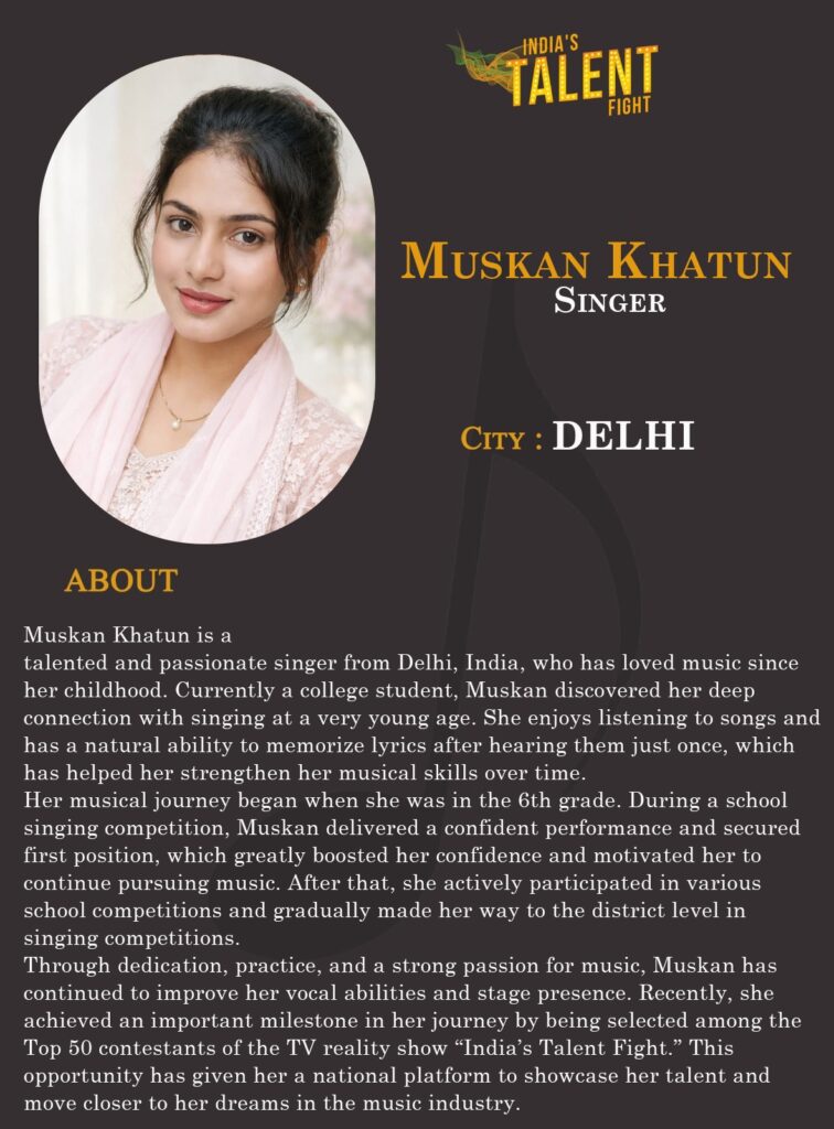 Through dedication, practice, and a strong passion for music, Muskan has continued to improve her vocal abilities and stage presence. Recently, she achieved an important milestone in her journey by being selected among the Top 50 contestants of the TV reality show “India’s Talent Fight.” This opportunity has given her a national platform to showcase her talent and move closer to her dreams in the music industry.