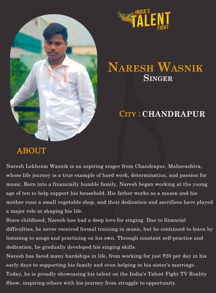 Naresh Lekhram Wasnik is an aspiring singer from Chandrapur, Maharashtra, whose life journey is a true example of hard work, determination, and passion for music. Born into a financially humble family, Naresh began working at the young age of ten to help support his household. His father works as a mason and his mother runs a small vegetable shop, and their dedication and sacrifices have played a major role in shaping his life.