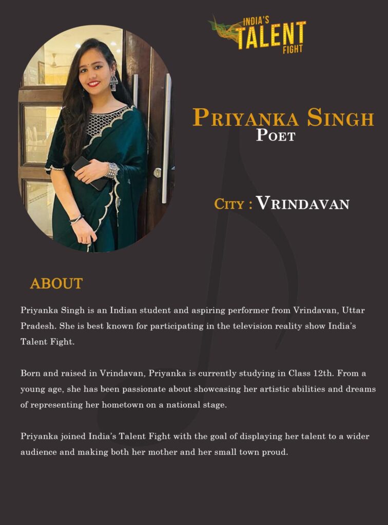 Priyanka Singh is an Indian student and aspiring performer from Vrindavan, Uttar Pradesh. She is best known for participating in the television reality show India’s Talent Fight.