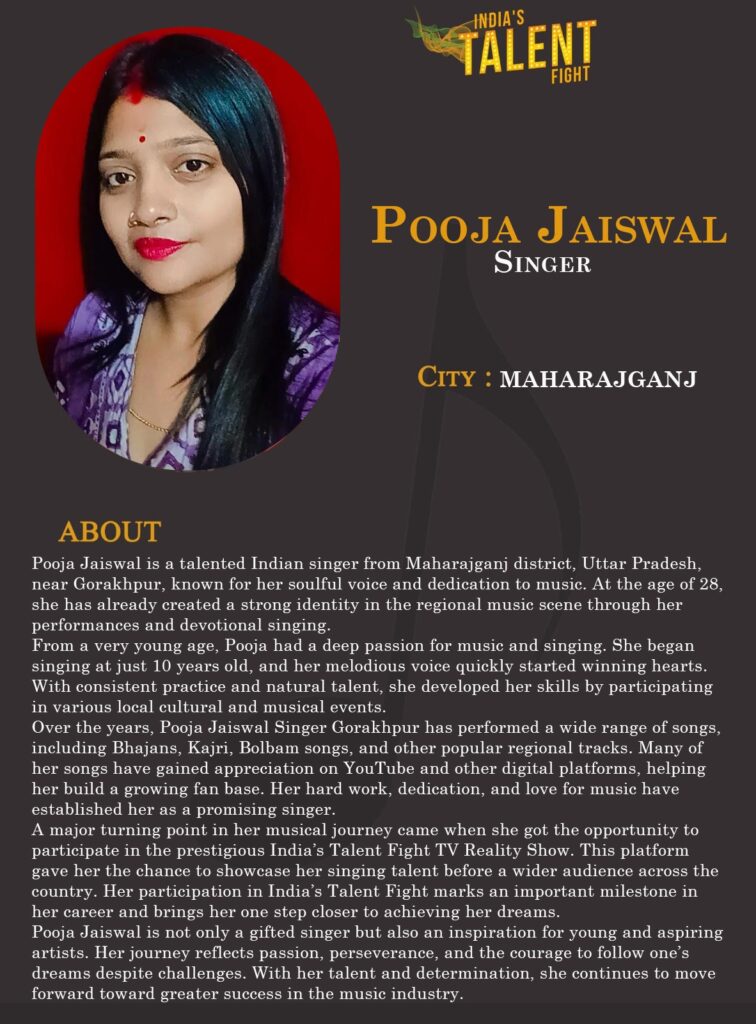 Pooja Jaiswal is a talented Indian singer from Maharajganj district, Uttar Pradesh, near Gorakhpur, known for her soulful voice and dedication to music. At the age of 28, she has already created a strong identity in the regional music scene through her performances and devotional singing.