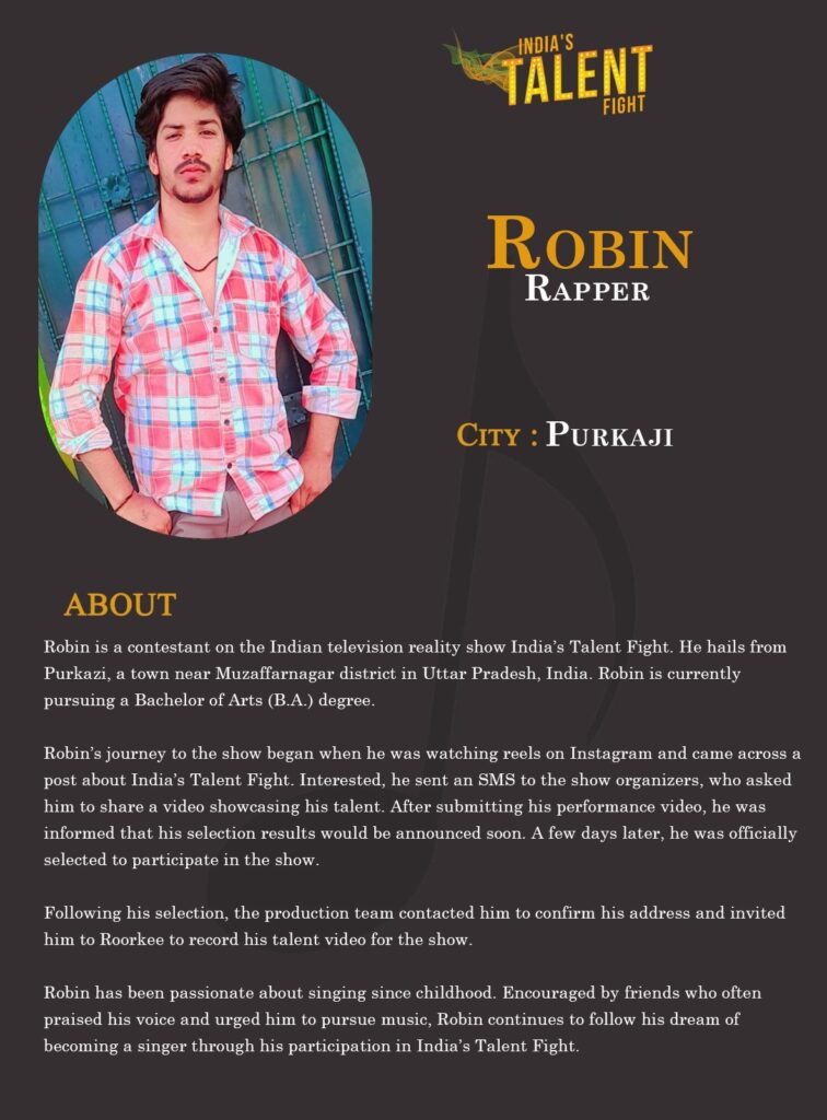 Robin is a contestant on the Indian television reality show India’s Talent Fight. He hails from Purkazi, a town near Muzaffarnagar district in Uttar Pradesh, India. Robin is currently pursuing a Bachelor of Arts (B.A.) degree.