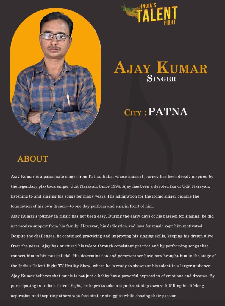 Ajay Kumar believes that music is not just a hobby but a powerful expression of emotions and dreams. By participating in India’s Talent Fight, he hopes to take a significant step toward fulfilling his lifelong aspiration and inspiring others who face similar struggles while chasing their passion.