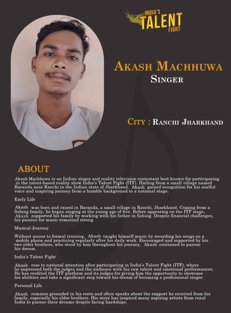 Akash Machhuwa is an Indian singer and reality television contestant best known for participating in the talent-based reality show India’s Talent Fight (ITF). Hailing from a small village named Baranda near Ranchi in the Indian state of Jharkhand, Akash gained recognition for his soulful voice and inspiring journey from a humble background to a national stage.