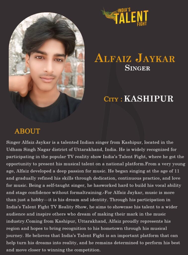 Coming from Kashipur, Uttarakhand, Alfaiz proudly represents his region and hopes to bring recognition to his hometown through his musical journey. He believes that India’s Talent Fight is an important platform that can help turn his dreams into reality, and he remains determined to perform his best and move closer to winning the competition.