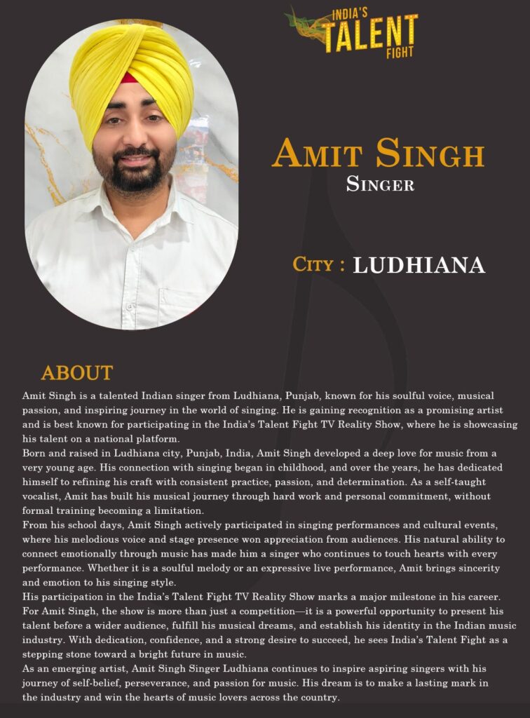 Amit Singh is a talented Indian singer from Ludhiana, Punjab, known for his soulful voice, musical passion, and inspiring journey in the world of singing. He is gaining recognition as a promising artist and is best known for participating in the India’s Talent Fight TV Reality Show, where he is showcasing his talent on a national platform.