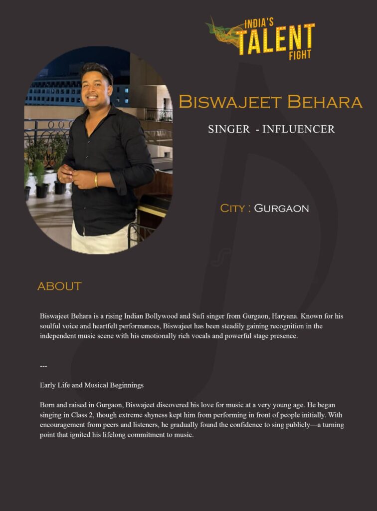 Biswajeet Behara is a rising Indian Bollywood and Sufi singer from Gurgaon, Haryana. Known for his soulful voice and heartfelt performances, Biswajeet has been steadily gaining recognition in the independent music scene with his emotionally rich vocals and powerful stage presence.