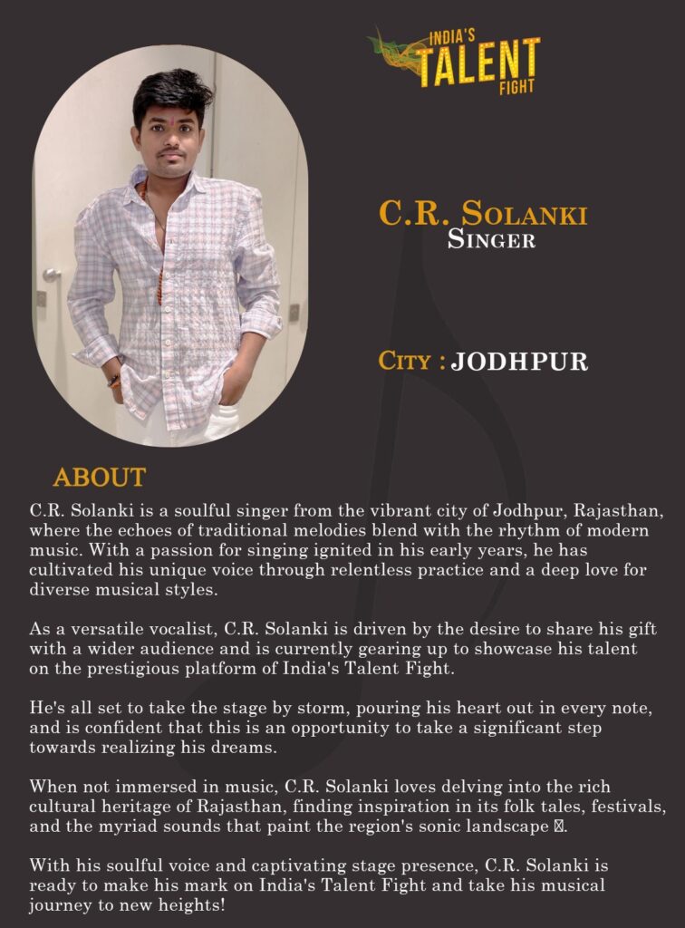 With his soulful voice and captivating stage presence, C.R. Solanki is ready to make his mark on India’s Talent Fight and take his musical journey to new heights!