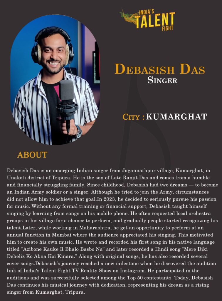 Debasish’s journey reached a new milestone when he discovered the audition link of India’s Talent Fight TV Reality Show on Instagram. He participated in the auditions and was successfully selected among the Top 50 contestants. Today, Debasish Das continues his musical journey with dedication, representing his dream as a rising singer from Kumarghat, Tripura.