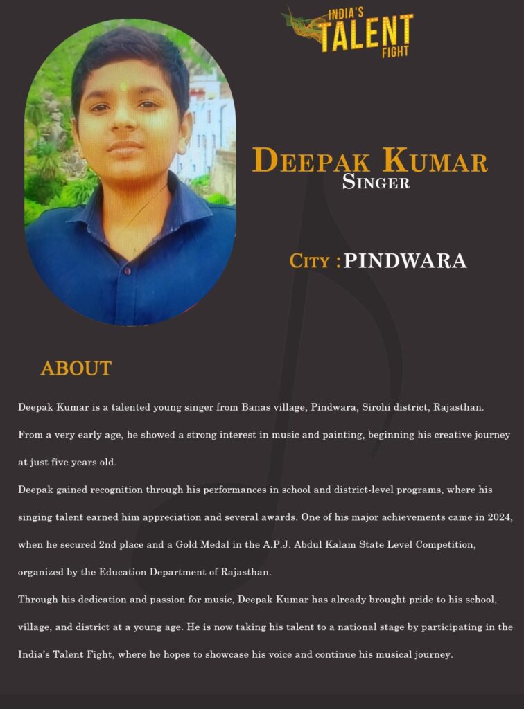 Through his dedication and passion for music, Deepak Kumar has already brought pride to his school, village, and district at a young age. He is now taking his talent to a national stage by participating in the India’s Talent Fight, where he hopes to showcase his voice and continue his musical journey.
