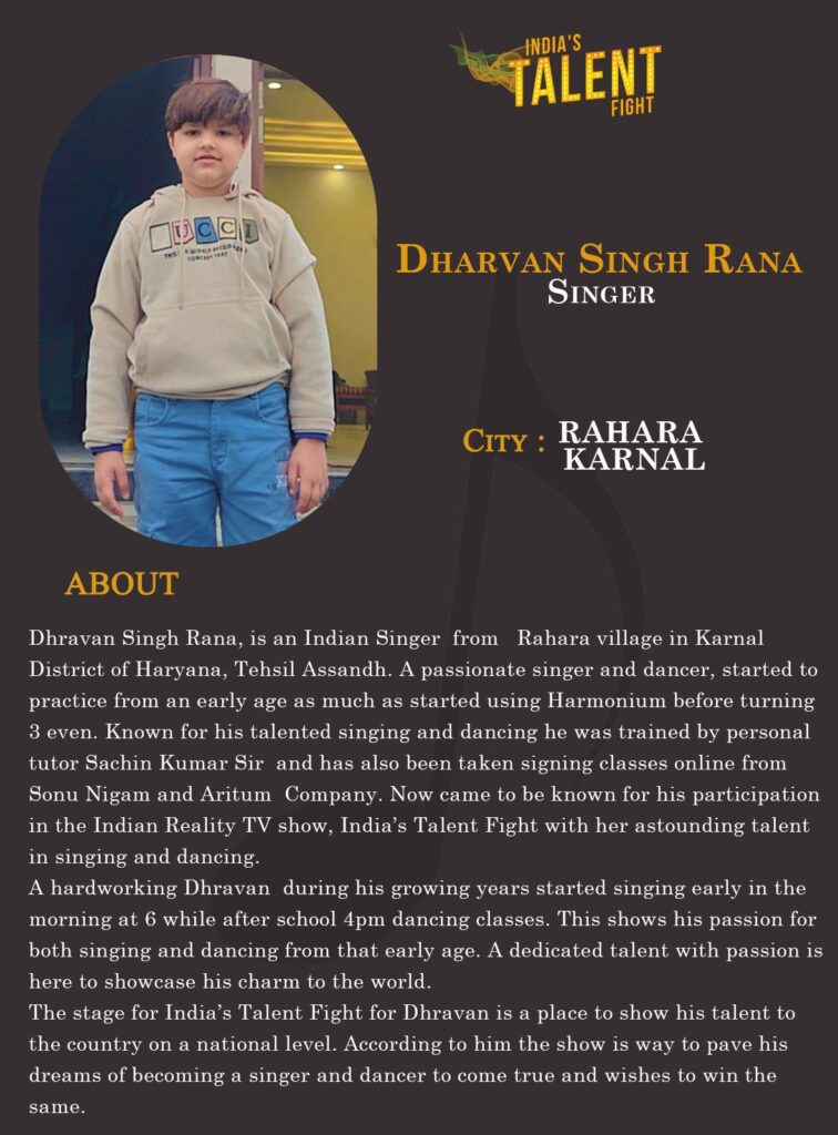 Dhravan Singh Rana, is an Indian Singer from Rahara village in Karnal District of Haryana, Tehsil Assandh. A passionate singer and dancer, started to practice from an early age as much as started using Harmonium before turning 3 even. Known for his talented singing and dancing he was trained by personal tutor Sachin Kumar Sir and has also been taken signing classes online from Sonu Nigam and Aritum Company. Now came to be known for his participation in the Indian Reality TV show, India’s Talent Fight with her astounding talent in singing and dancing.