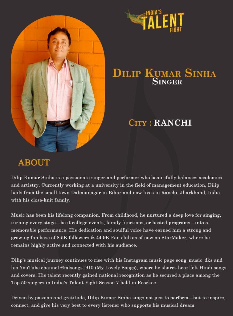 Dilip’s musical journey continues to rise with his Instagram music page song_music_dks and his YouTube channel @mlsongs1910 (My Lovely Songs), where he shares heartfelt Hindi songs and covers. His talent recently gained national recognition as he secured a place among the Top 50 singers in India’s Talent Fight Season 7 held in Roorkee.