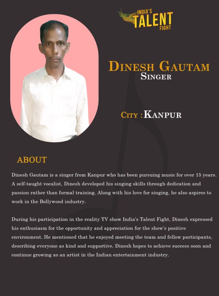 Dinesh Gautam is a singer from Kanpur who has been pursuing music for over 15 years. A self-taught vocalist, Dinesh developed his singing skills through dedication and passion rather than formal training. Along with his love for singing, he also aspires to work in the Bollywood industry.