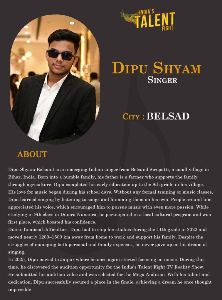 In 2025, Dipu moved to Jaipur where he once again started focusing on music. During this time, he discovered the audition opportunity for the India’s Talent Fight TV Reality Show. He submitted his audition video and was selected for the Mega Audition. With his talent and dedication, Dipu successfully secured a place in the finale, achieving a dream he once thought impossible.