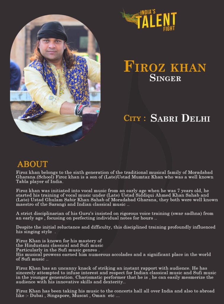 Firoz khan was initiated into vocal music from an early age when he was 7 years old, he started his training of vocal music under (Late) Ustad Siddiqui Ahmed Khan Sahab and (Late) Ustad Ghulam Sabir Khan Sahab of Moradabad Gharana, they both were well known maestro of the Sarangi and Indian classical music ..