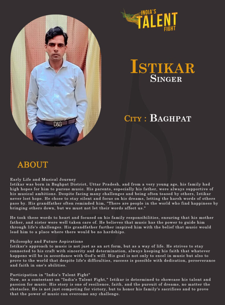 Now, as a contestant on “India’s Talent Fight,” Istikar is determined to showcase his talent and passion for music. His story is one of resilience, faith, and the pursuit of dreams, no matter the obstacles. He is not just competing for victory, but to honor his family’s sacrifices and to prove that the power of music can overcome any challenge.