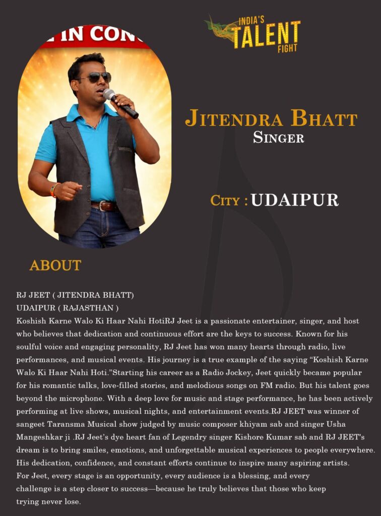 RJ Jeet is a passionate entertainer, singer, and host who believes that dedication and continuous effort are the keys to success. Known for his soulful voice and engaging personality, RJ Jeet has won many hearts through radio, live performances, and musical events. His journey is a true example of the saying “Koshish Karne Walo Ki Haar Nahi Hoti.”