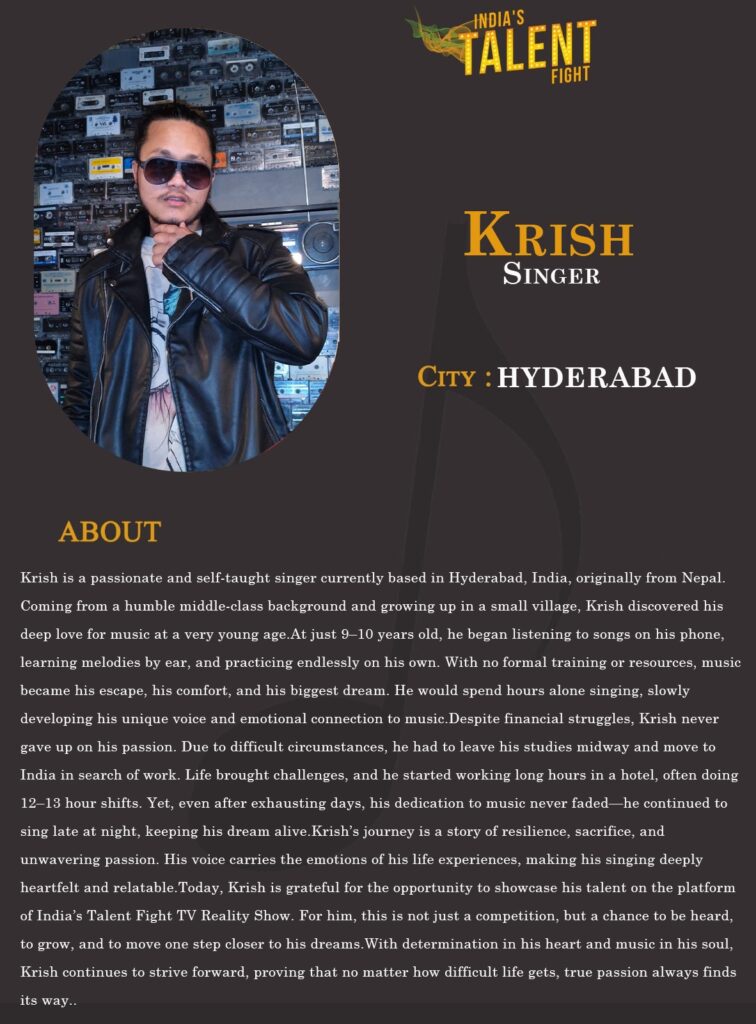 Today, Krish is grateful for the opportunity to showcase his talent on the platform of India’s Talent Fight TV Reality Show. For him, this is not just a competition, but a chance to be heard, to grow, and to move one step closer to his dreams.