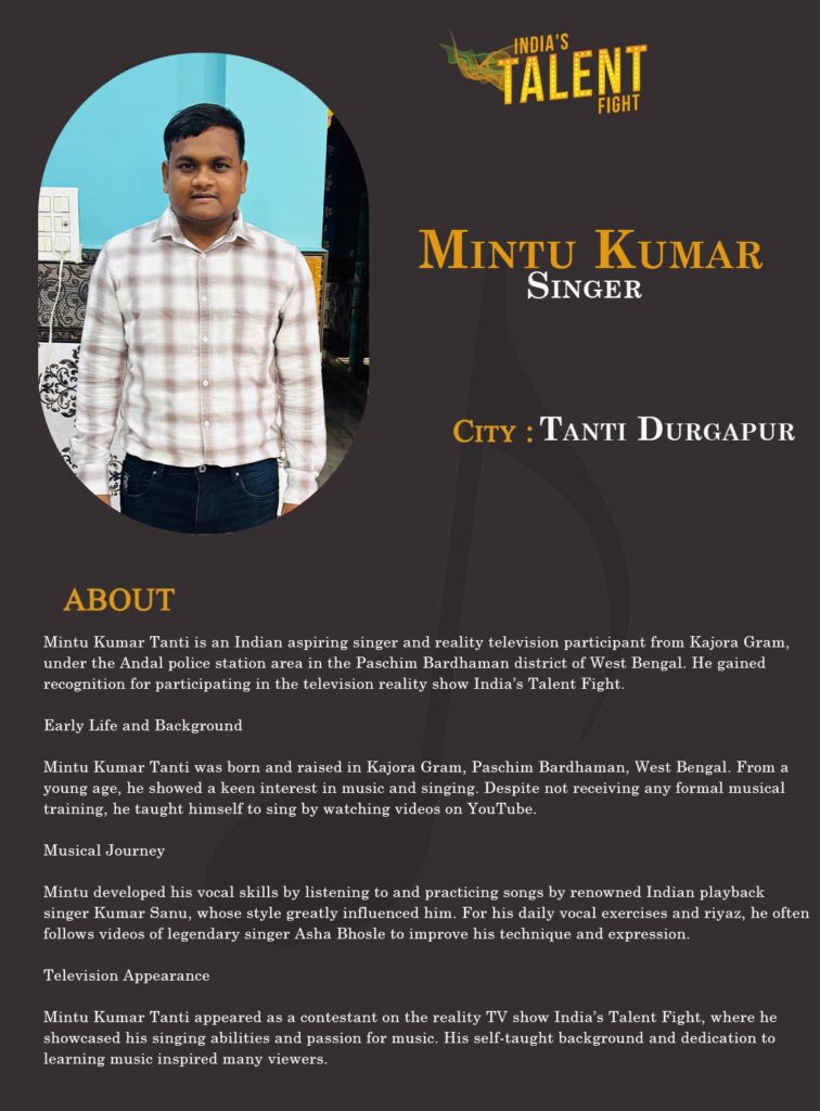 Mintu Kumar Tanti is an Indian aspiring singer and reality television participant from Kajora Gram, under the Andal police station area in the Paschim Bardhaman district of West Bengal. He gained recognition for participating in the television reality show India’s Talent Fight.