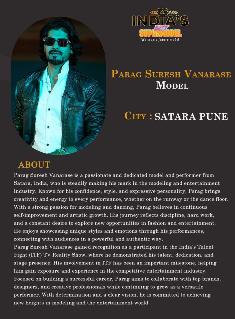 Parag Suresh Vanarase is a passionate and dedicated model and performer from Satara, India, who is steadily making his mark in the modeling and entertainment industry. Known for his confidence, style, and expressive personality, Parag brings creativity and energy to every performance, whether on the runway or the dance floor.