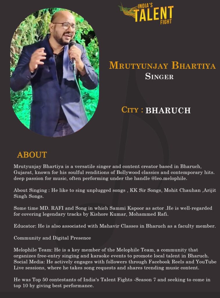 versatile singer and content creator based in Bharuch, Gujarat, known for his soulful renditions of Bollywood classics and contemporary hits. deep passion for music, often performing under the handle @leo.melophile.