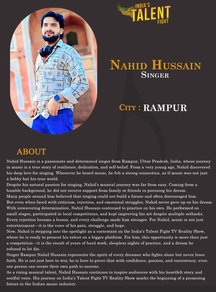 As a rising musical talent, Nahid Hussain continues to inspire audiences with his heartfelt story and soulful voice. His journey on India’s Talent Fight TV Reality Show marks the beginning of a promising future in the Indian music industry.