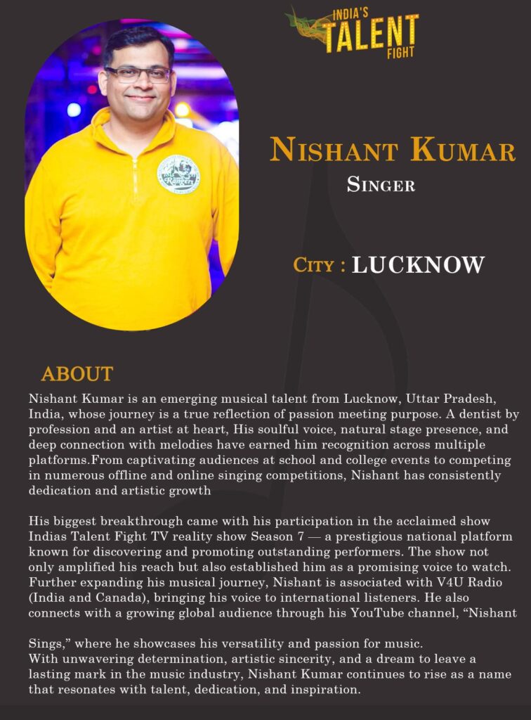 Nishant Kumar is an emerging musical talent from Lucknow, Uttar Pradesh, India, whose journey is a true reflection of passion meeting purpose. A dentist by profession and an artist at heart, His soulful voice, natural stage presence, and deep connection with melodies have earned him recognition across multiple platforms.