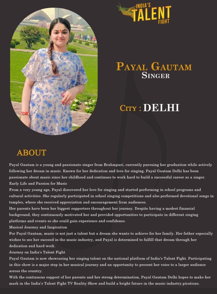 Payal Gautam is now showcasing her singing talent on the national platform of India’s Talent Fight. Participating in this show is a major step in her musical journey and an opportunity to present her voice to a larger audience across the country.