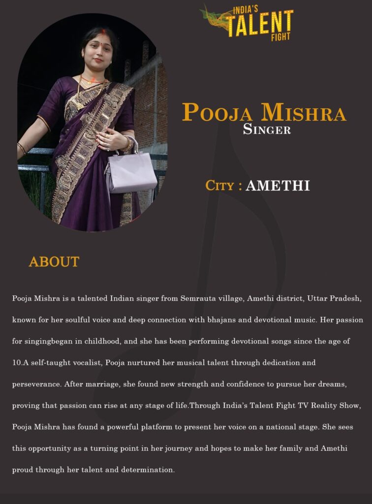 Through India’s Talent Fight TV Reality Show, Pooja Mishra has found a powerful platform to present her voice on a national stage. She sees this opportunity as a turning point in her journey and hopes to make her family and Amethi proud through her talent and determination.