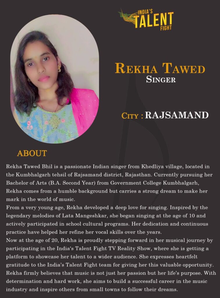 Now at the age of 20, Rekha is proudly stepping forward in her musical journey by participating in the India’s Talent Fight TV Reality Show, where she is getting a platform to showcase her talent to a wider audience. She expresses heartfelt gratitude to the India’s Talent Fight team for giving her this valuable opportunity.