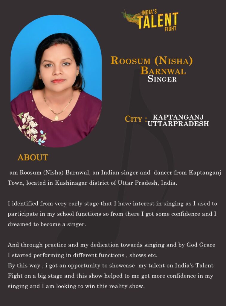 I am Roosum (Nisha) Barnwal, an Indian singer and dancer from Kaptanganj Town, located in Kushinagar district of Uttar Pradesh, India.