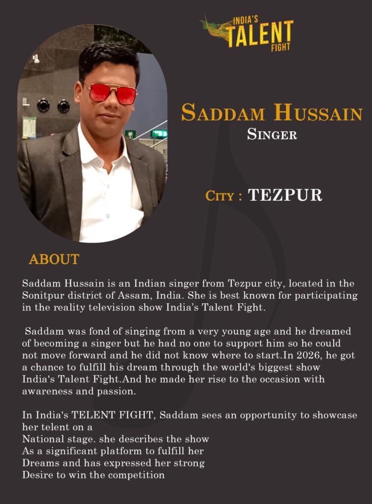 Saddam Hussain is an Indian singer from Tezpur city, located in the Sonitpur district of Assam, India. She is best known for participating in the reality television show India’s Talent Fight.
