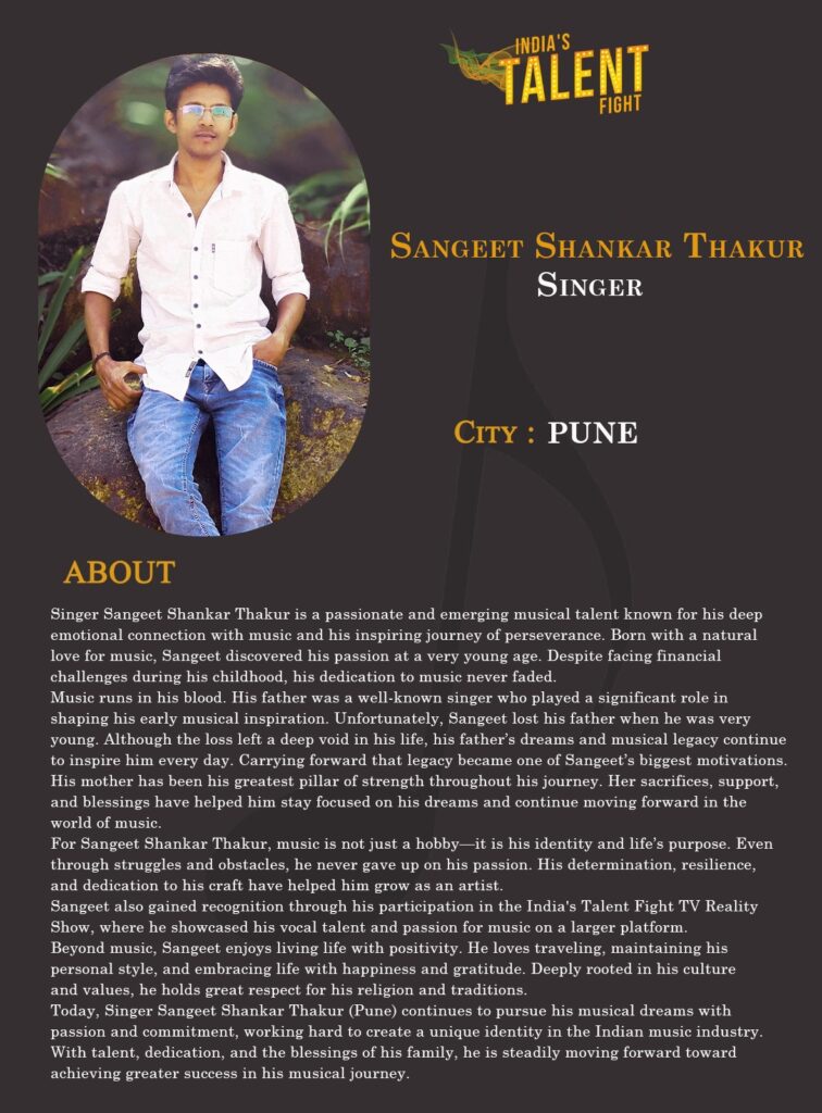 Today, Singer Sangeet Shankar Thakur (Pune) continues to pursue his musical dreams with passion and commitment, working hard to create a unique identity in the Indian music industry. With talent, dedication, and the blessings of his family, he is steadily moving forward toward achieving greater success in his musical journey.