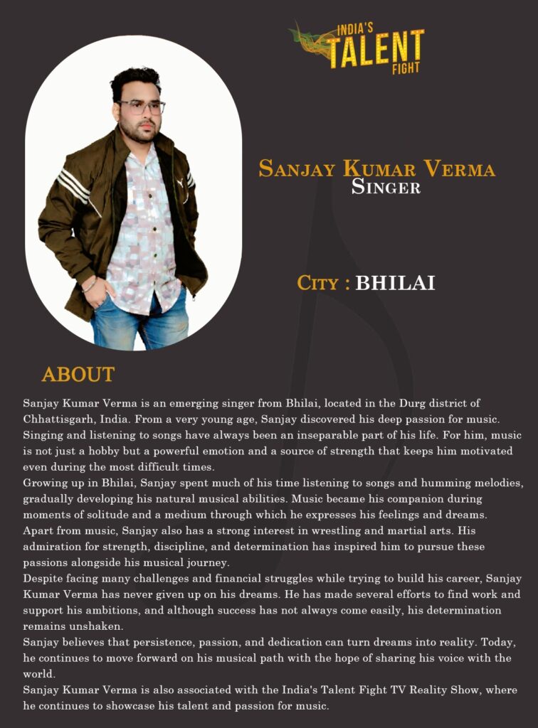 Sanjay Kumar Verma is an emerging singer from Bhilai, located in the Durg district of Chhattisgarh, India. From a very young age, Sanjay discovered his deep passion for music. Singing and listening to songs have always been an inseparable part of his life. For him, music is not just a hobby but a powerful emotion and a source of strength that keeps him motivated even during the most difficult times.