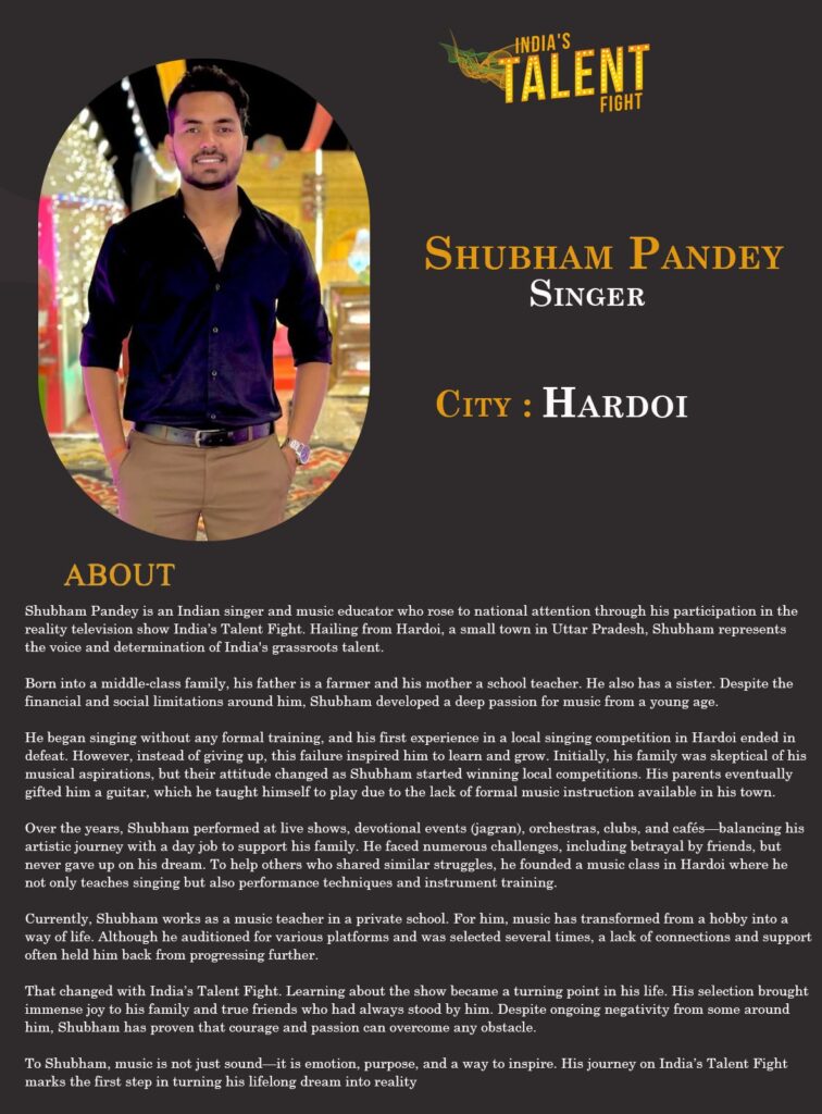 Shubham Pandey is an Indian singer and music educator who rose to national attention through his participation in the reality television show India’s Talent Fight. Hailing from Hardoi, a small town in Uttar Pradesh, Shubham represents the voice and determination of India’s grassroots talent.