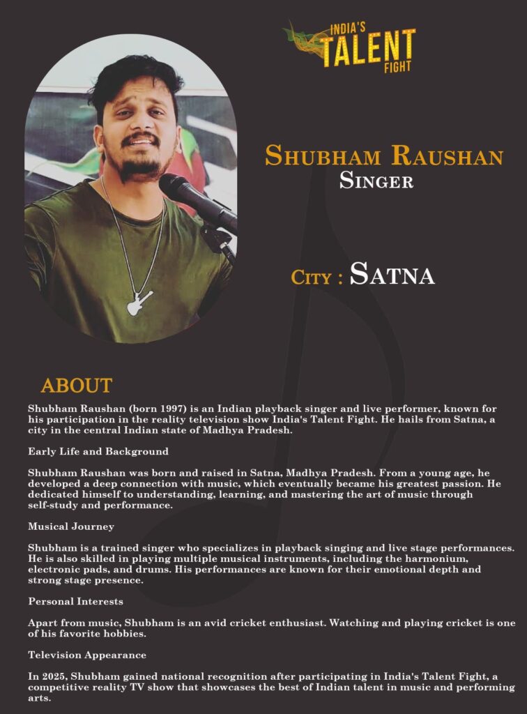 Shubham Raushan (born 1997) is an Indian playback singer and live performer, known for his participation in the reality television show India’s Talent Fight. He hails from Satna, a city in the central Indian state of Madhya Pradesh.