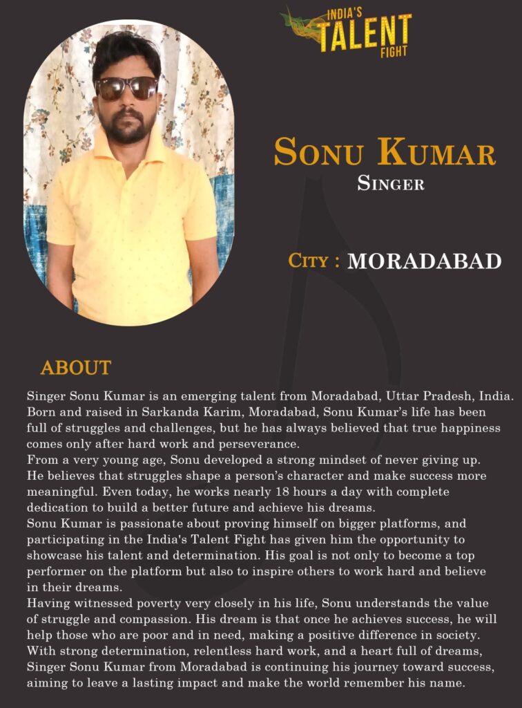 With strong determination, relentless hard work, and a heart full of dreams, Singer Sonu Kumar from Moradabad is continuing his journey toward success, aiming to leave a lasting impact and make the world remember his name.