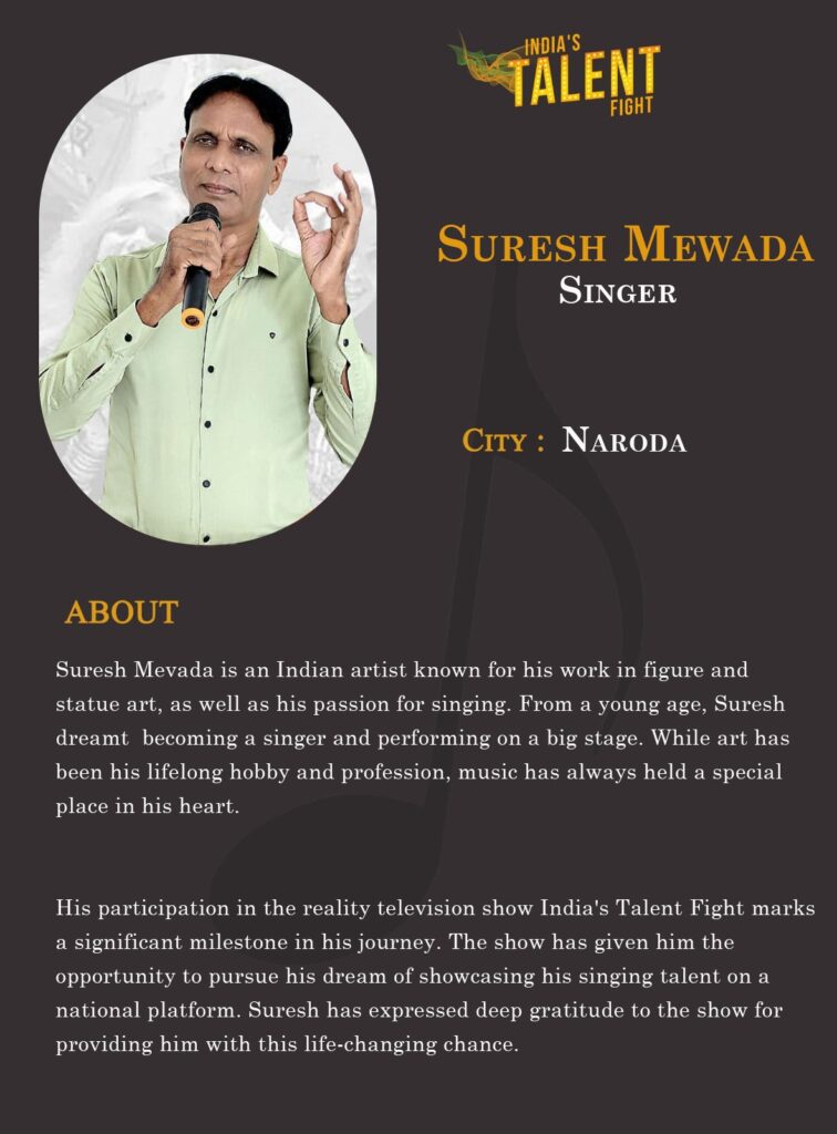 Suresh Mewada is an Indian artist known for his work in figure and statue art, as well as his passion for singing. From a young age, Suresh dreamt of becoming a singer and performing on a big stage. While art has been his lifelong hobby and profession, music has always held a special place in his heart.
