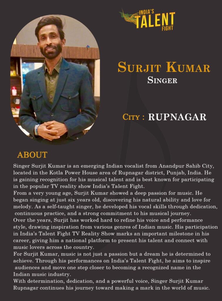 Singer Surjit Kumar is an emerging Indian vocalist from Anandpur Sahib City, located in the Kotla Power House area of Rupnagar district, Punjab, India. He is gaining recognition for his musical talent and is best known for participating in the popular TV reality show India’s Talent Fight.