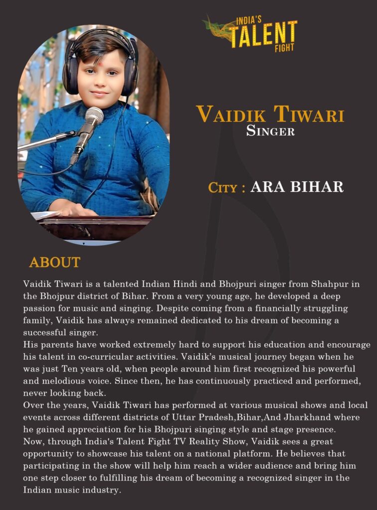 Now, through India’s Talent Fight TV Reality Show, Vaidik sees a great opportunity to showcase his talent on a national platform. He believes that participating in the show will help him reach a wider audience and bring him one step closer to fulfilling his dream of becoming a recognized singer in the Indian music industry.
