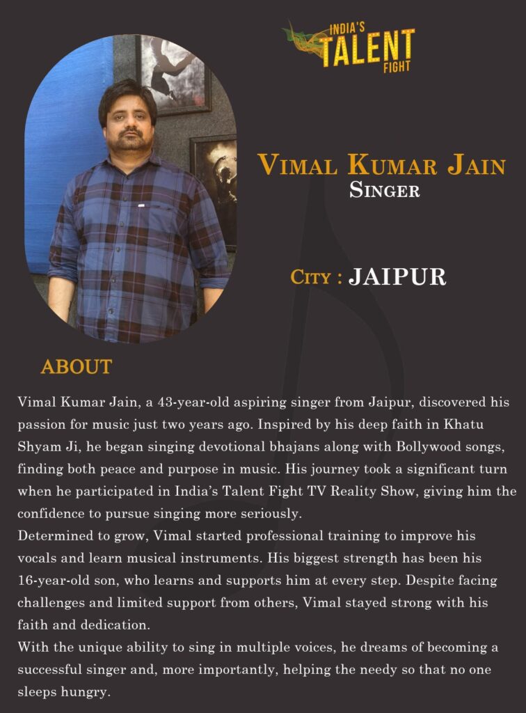 Vimal Kumar Jain, a 43-year-old aspiring singer from Jaipur, discovered his passion for music just two years ago. Inspired by his deep faith in Khatu Shyam Ji, he began singing devotional bhajans along with Bollywood songs, finding both peace and purpose in music. His journey took a significant turn when he participated in India’s Talent Fight TV Reality Show, giving him the confidence to pursue singing more seriously.