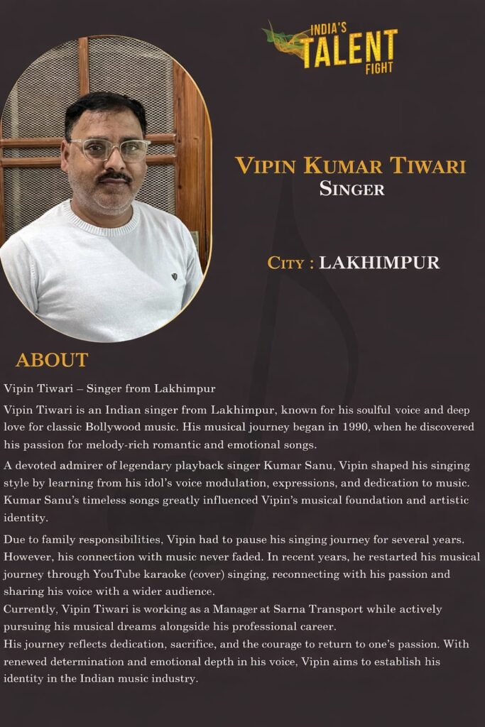 Vipin Tiwari is an Indian singer from Lakhimpur, known for his soulful voice and deep love for classic Bollywood music. His musical journey began in 1990, when he discovered his passion for melody-rich romantic and emotional songs.