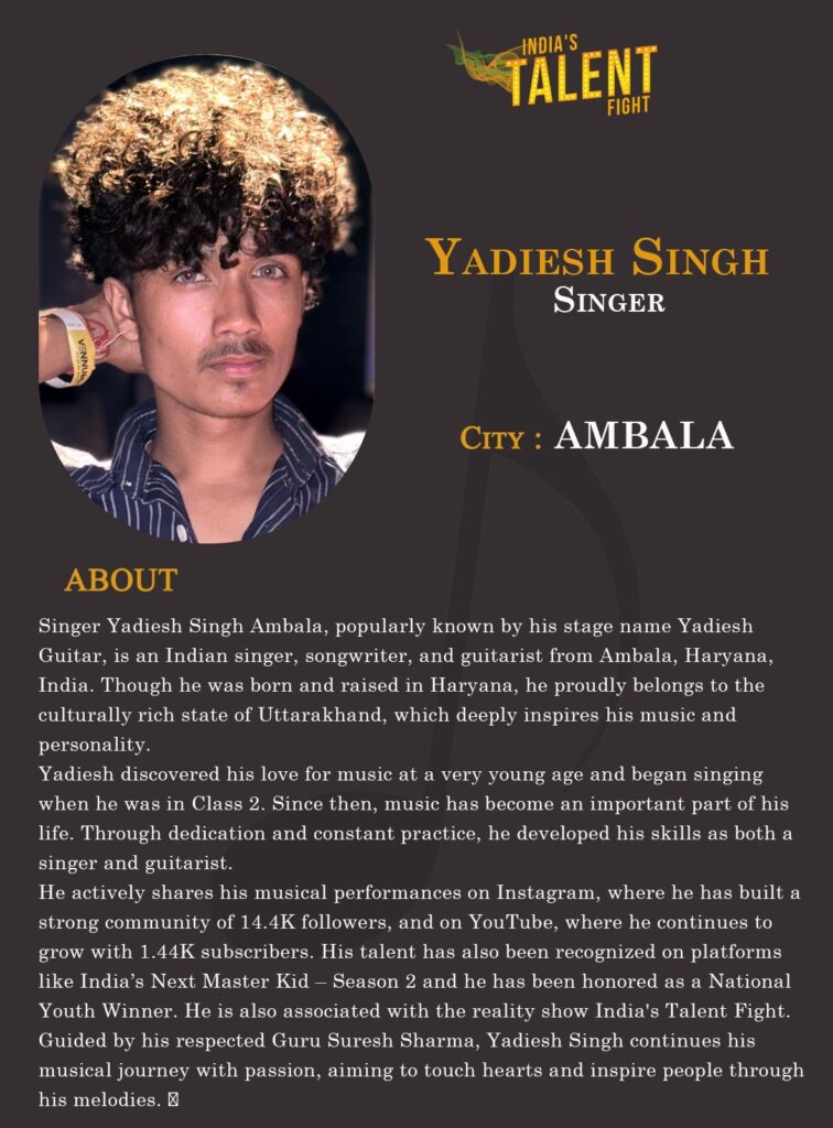 Singer Yadiesh Singh Ambala, popularly known by his stage name Yadiesh Guitar, is an Indian singer, songwriter, and guitarist from Ambala, Haryana, India. Though he was born and raised in Haryana, he proudly belongs to the culturally rich state of Uttarakhand, which deeply inspires his music and personality.