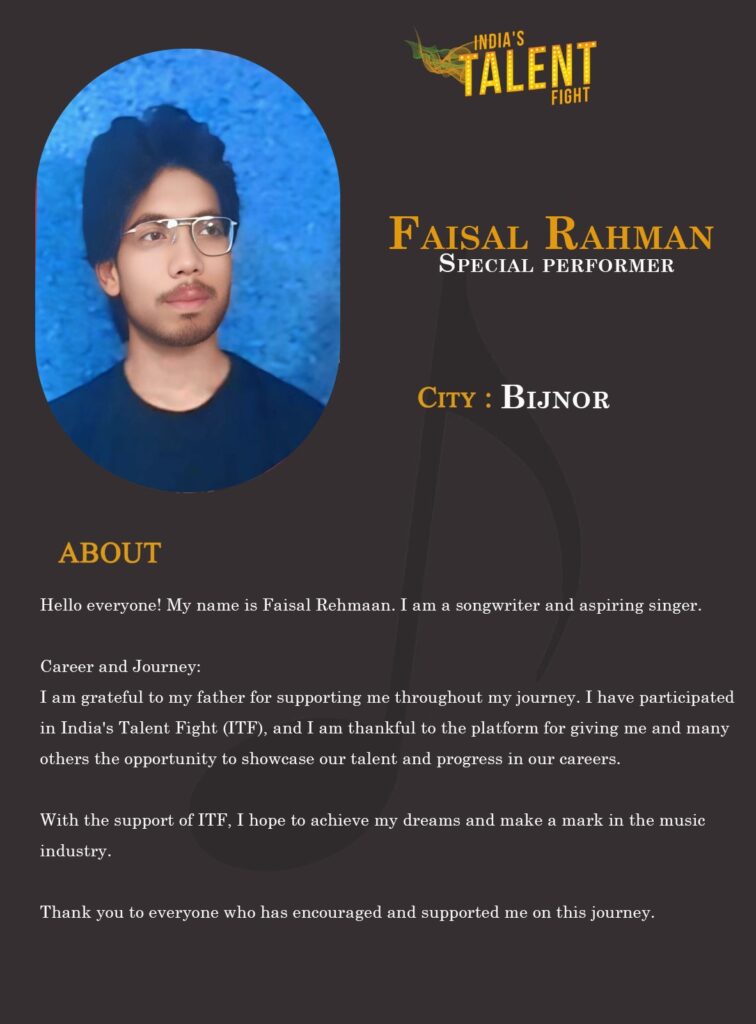 I am grateful to my father for supporting me throughout my journey. I have participated in India’s Talent Fight (ITF), and I am thankful to the platform for giving me and many others the opportunity to showcase our talent and progress in our careers.